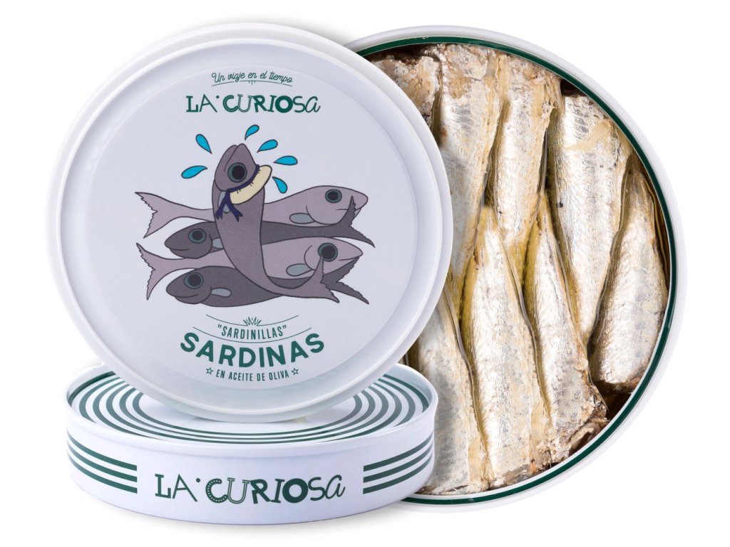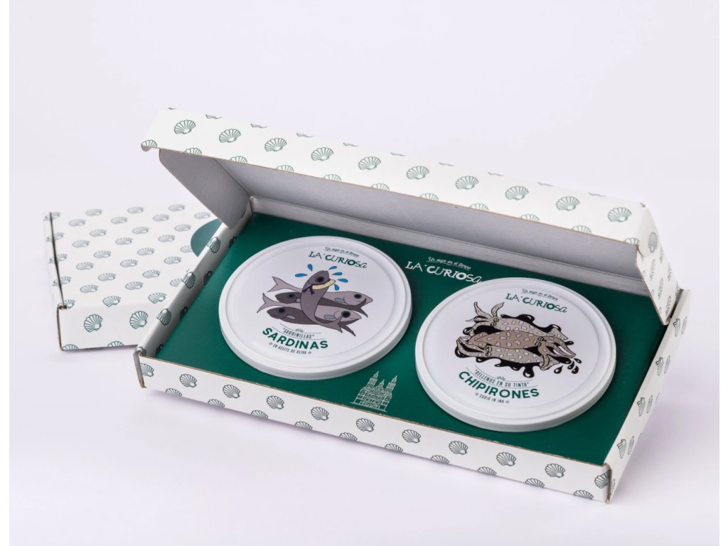 Balení dvou konzerv značky La Curiosa. Jemné sardinky v olivovém oleji a baby kalamáry ve vlastní šťávě s inkoustem pro nevšední gurmánský zážitek.