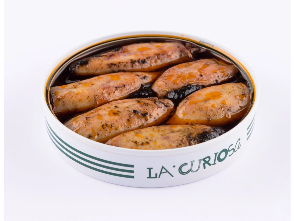 Pečlivě ručně plněné kalamáry – výhradně jejich vlastními chapadly – jsou čerstvě zavařené v syté, tmavé omáčce z jejich vlastního inkoustu.