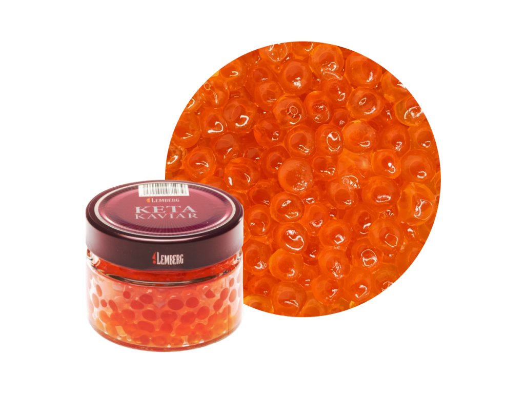 • Kaviár z divokého lososa Keta – větší, pevné jikry se sytou jantarovou barvou a jemně máslovou chutí.