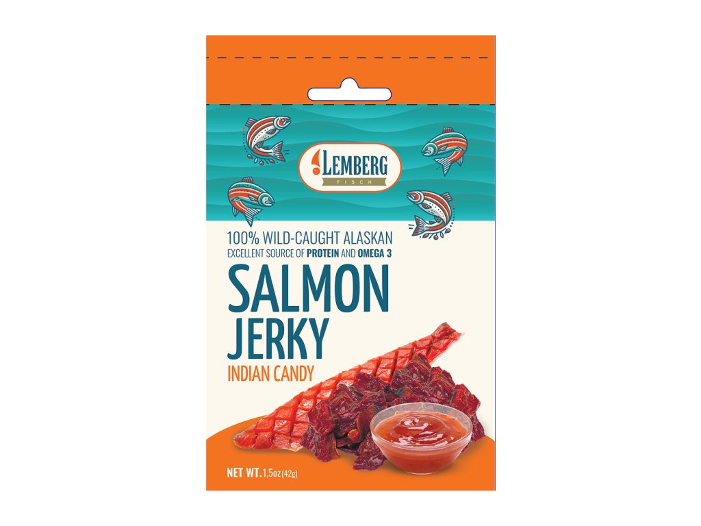 Sušený proužky z lososa nerka v jemně sladké omáčce „Indian Candy“. Produkt je tepelně opracovaný, vakuově balený a připravený k přímé konzumaci. Vysoký obsah bílkovin, bez GMO.